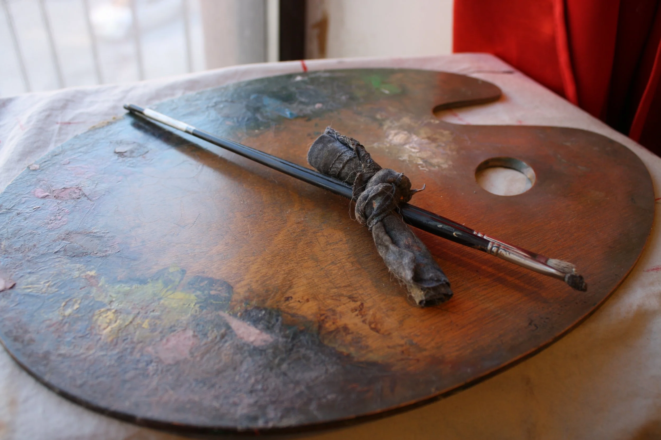 Upon completion of the underpainting, the rag is rolled with the paint and ash mixture on the inside, tied around the brushes used, and set aside to dry.